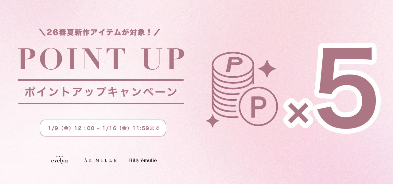 26春夏新作が対象、キャンペーン期間中に以下のクーポンコードを入力すると、通常商品代金(税込)の1%をポイント還元のところ5%還元いたします!